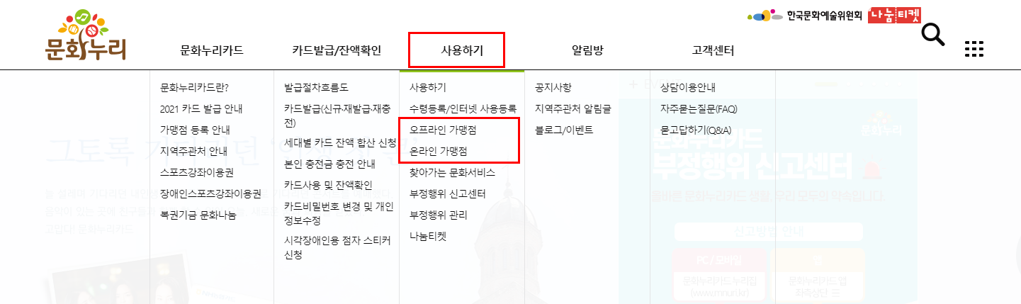 1. 문화누리카드 홈페이지에서 사용하기 → 오프라인 가맹점, 온라인 가맹점을 클릭해주세요.