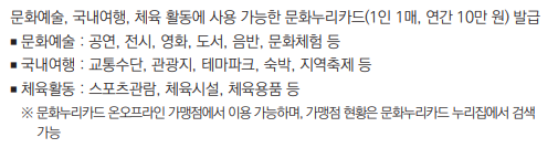 문화누리카드는 문화예술, 국내여행, 체육 활동에 사용 가능한 문화누리카드 1인 1매, 연간 10만 원이 발급됩니다.
