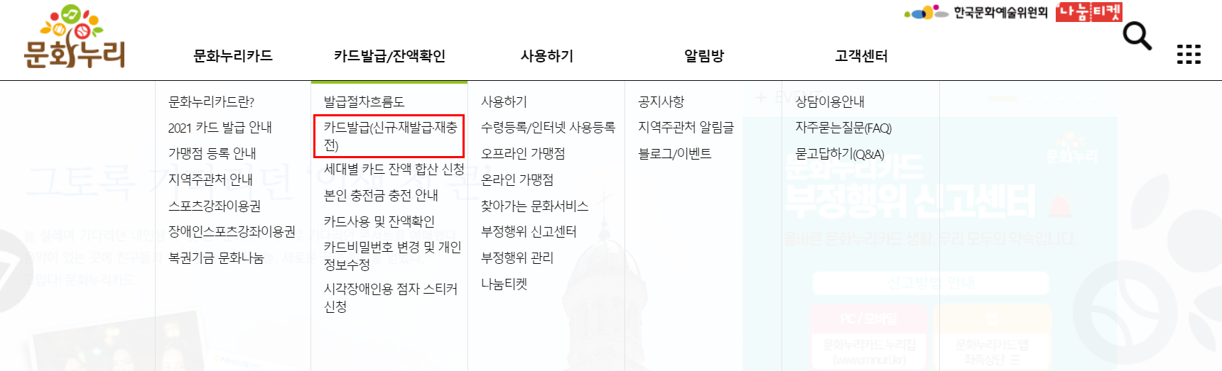 1. 문화누리 홈페이지에 접속하신 후, 카드 발급/잔액 확인 → 카드 발급(신규 재발급, 재충전) 클릭해주세요.