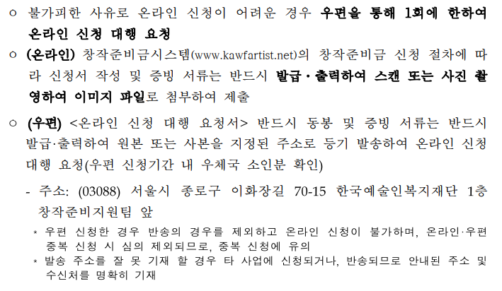 - 창작준비금을 교부받은 예술인은 한국예술인 복지재단에서 요청하는 경우 인터뷰, 모니터링, 간단회 등에 참여할 수 있으니 참고 바랍니다.