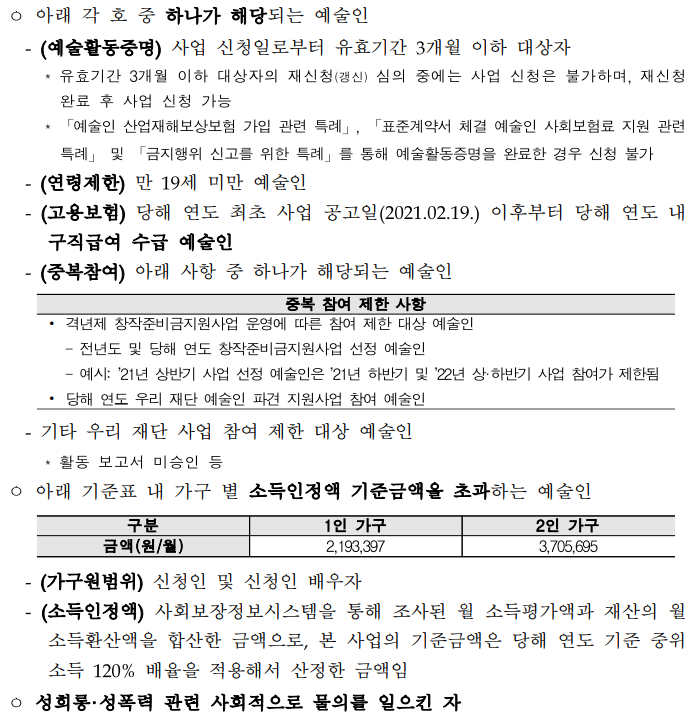 - (예술활동 증명) : 예술복지법 상 예술활동 증명을 완료한 예술인(국내 거주 내국인에 한함)이며, 예술활동 증명 잔여 유효기간이 3개월 이상인 예술인